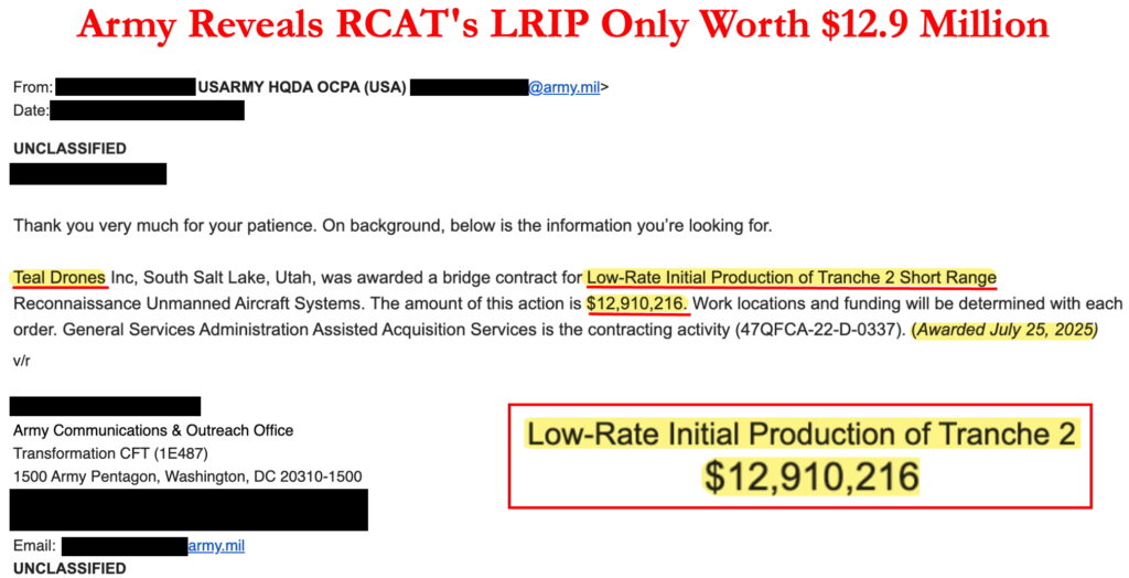 Quick Background – In November 2024, Red Cat announced their subsidiary Teal Drones winning a contract for the Army SRR (Short-Range Reconnaissance) drone contract. Red Cat claimed it was a “long-term contract” and that it was “sole-sourced.” The reality was that at the time Red Cat didn’t even have a signed contract. It then took 9 months for them to get the initial LRIP (low rate of initial production) signed.