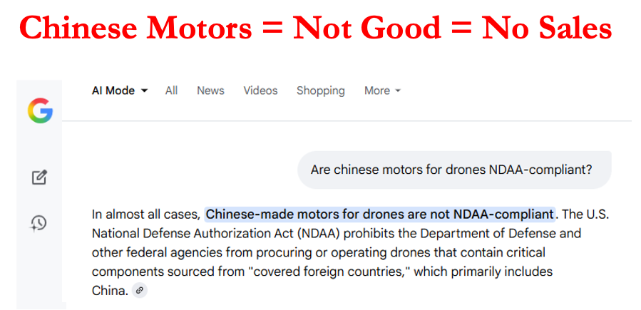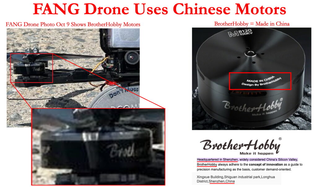 A photo of the FANG taken at a drone competition on Oct.9 in North Carolina and posted on LinkedIn by Red Cat itself clearly show motors made in China by a Chinese company called BrotherHobby.