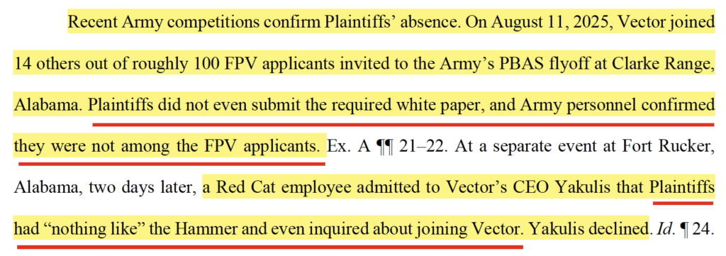 A Red Cat employee even admitted they “had nothing like” Vector’s Hammer FPV drone and even inquired about joining the competitor that makes it, Vector Defense.