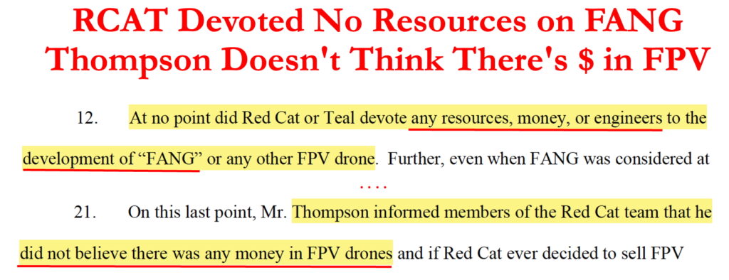 According to George Matus, Red Cat’s former CTO, Red Cat spent no resources on developing FANG while he was there. Jeff Thompson didn’t believe there was money in FPV drones!