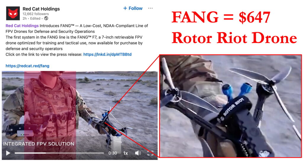 Why spend years on R&D making a unique drone when you can buy a $650-$750 Rotor Riot drone, tie a bomb to it and rename it FANG F7? Red Cat’s own marketing video accidentally shows that the new FANG drone is actually just a Rotor Riot drone.