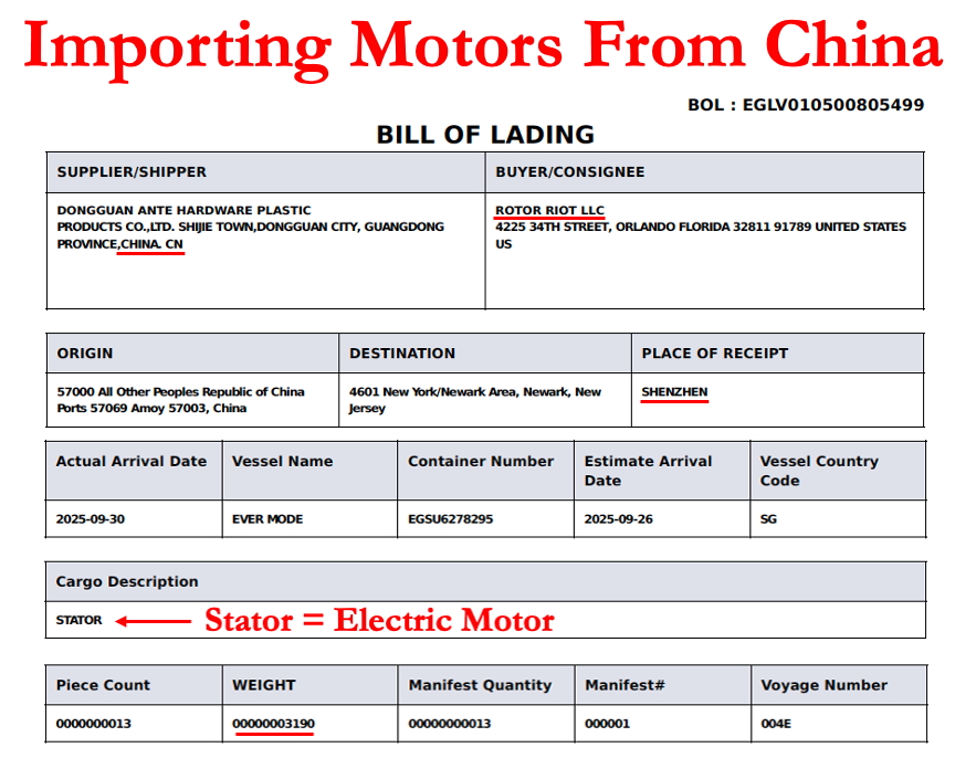 Bill of Lading Show Rotor Riot Importing Drone Motors From China